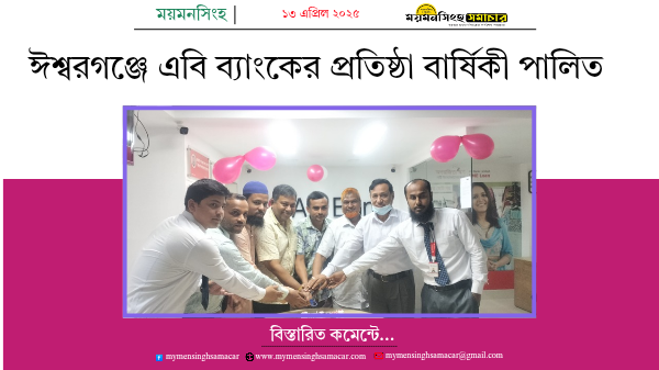 ময়মনসিংহের ঈশ্বরগঞ্জে মিলাদ মাহফিল ও কেক কেটে দেশের প্রথম প্রাইভেট বাণিজ্যিক ব্যাংক এবি ব্যাংকের এর ৪৩তম প্রতিষ্ঠা বার্ষিকী পালন করা হয়েছে।